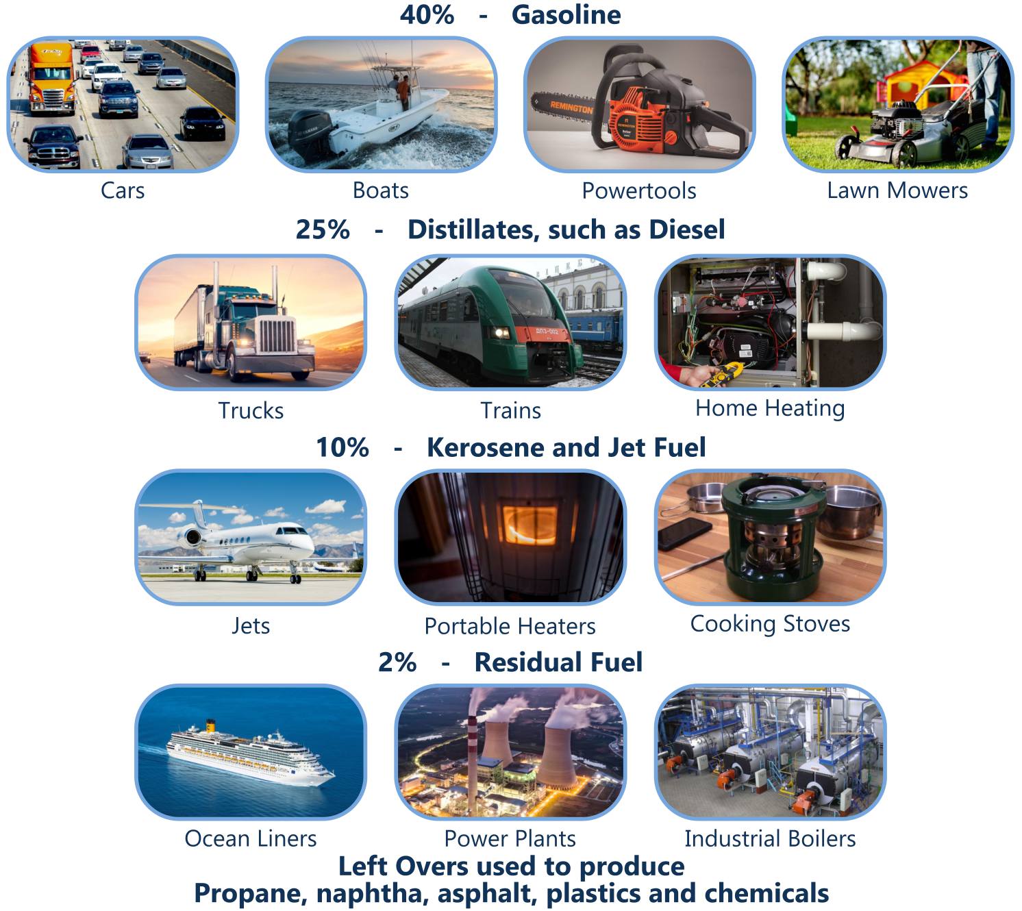Crude Oil is decomposed organic matter which has been subjected to intense heat and pressure, formed in reservoirs deep in the earth. Once located the oil is extracted with pumps and transported via pipelines, ships, rail, or trucks to a refinery for processing. Firstly gas is extracted, then water is separated from the oil and finally any sand is filtered out. The refining process produces gasoline, diesel, jetfuel and asphalt. Oil is also used to make plastics and petrochemicals.